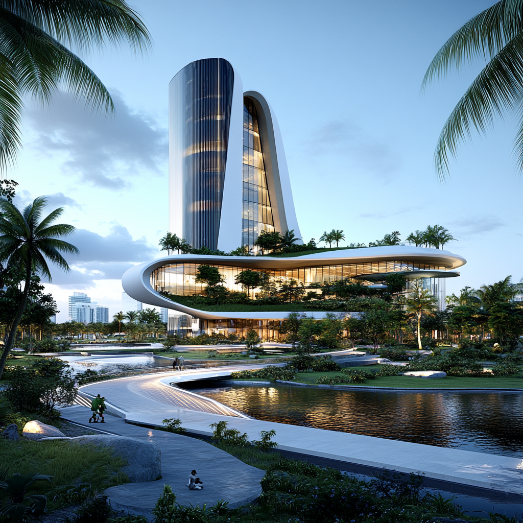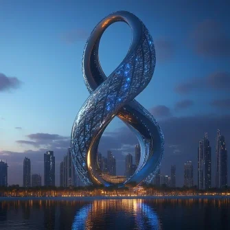 Der Infinity Tower basiert auf einer geschwungenen, ∞-inspirierten Doppelform mit leichten Metallstrukturen, hoch performanten Glasfassaden (≤15 % Reflexion) und adaptiven Gebäudehüllen zur Optimierung von Licht- und Wärmeeintrag. Die vertikale Nutzung kombiniert hochwertige Wohn- und Hotelfunktionen, einschließlich eines 7-Sterne-Plus-Hotelkomplexes in den oberen Ebenen. Die umgebende Landschaftsarchitektur integriert vertikale Gärten, thermisch wirksame Grünflächen und einen 500-Meter-Infinity-Pool als zentrale Achse.